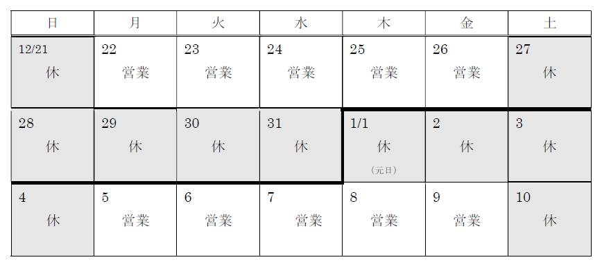 【休業期間】 2025年12月27日(土)~2026年1月4日(日)